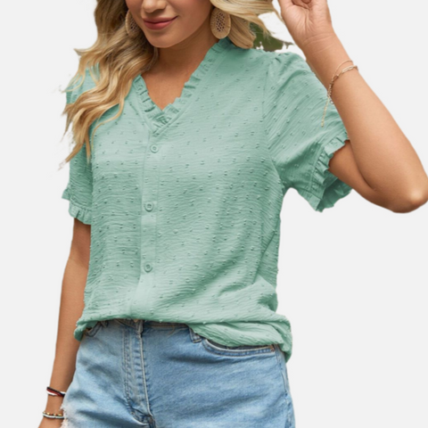 Another style that you can try is the flare short sleeve one. The flare short sleeve can add some volume and movement to your arms, making them look more slender and graceful. It can also create a contrast with your body shape, highlighting your curves. You can wear it with a belt or tuck it into your pants or skirt .