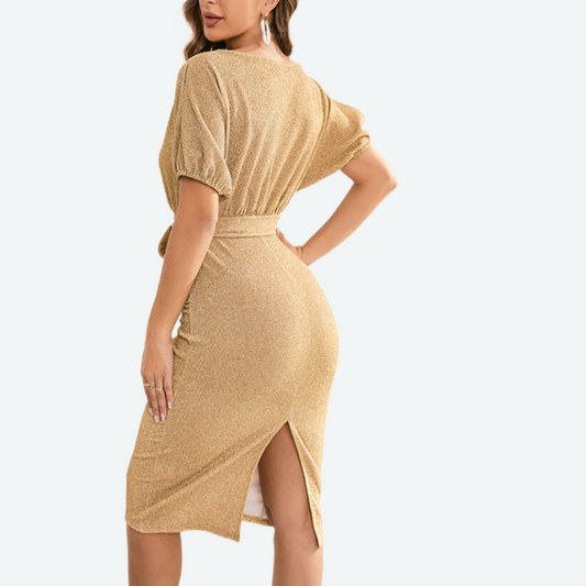 Women's Sparkly Metallic Dress Xmas Party Dress V-neck Prom Dress in Golden Shiny