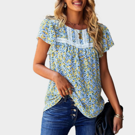 Floral Blue Top with Ruffle Short Sleeve