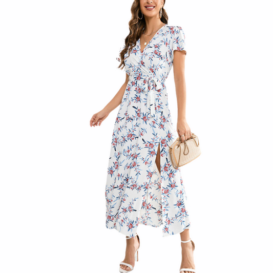 Christmas Dresses for Women Long Sleeve V-neck Long Waist Tie Dress in White
