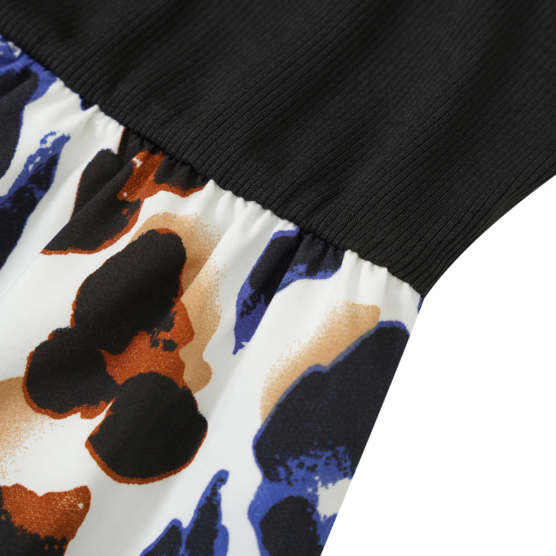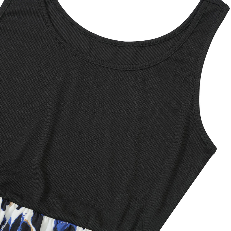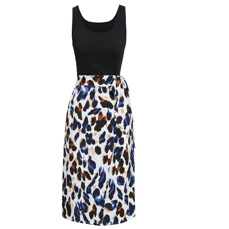 This charming Animal Print Dresses features a sleeveless design and a classic A-line silhouette that showcases graceful curves and a light and airy feel. It is built upon a black knitted vest and paired with a mid-length skirt adorned with animal print, offering a trendy and avant-garde yet gentle and feminine look. The waist comes with a delicate belt that can be tied into a chic bow, simple yet elegant and refined, making it an essential fashion item for hot summer days.