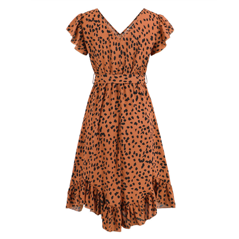 This Leopard Midi Dress features a plunging V-neckline that accentuates your collarbones and draws attention to your décolletage. The ruffle cap sleeves add a hint of playfulness to the silhouette, while the waist tie cinches at your waist for a flattering fit. With its midi length and irregular hemline adorned with ruffles, this dress exudes an air of sophistication and femininity.The fabric is made from rayon and has a super soft feel, like silk. It drapes elegantly and looks luxurious, just like real silk! This dress is the perfect statement piece for any occasion - from a night out on the town to an upscale cocktail party.