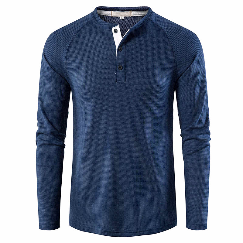 A men's waffle knitted T-shrit, 3 button closure, henley collar, made with soft textured waffle knit fabric, Perfect for comfortable, casual wear, this relaxed fit men's Henley helps keep you warm on fall evenings and cool weekend mornings.