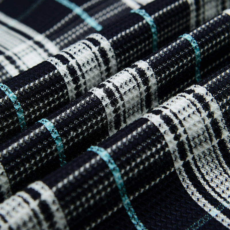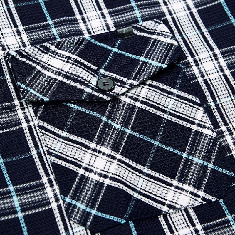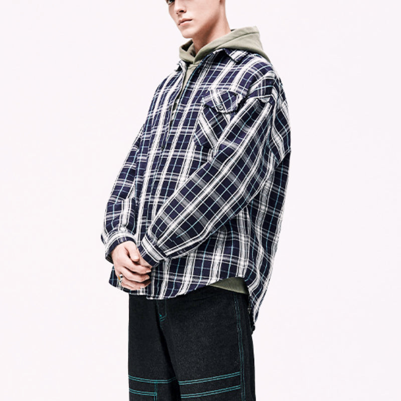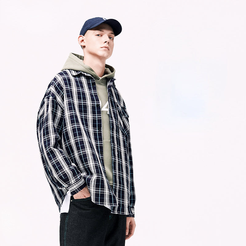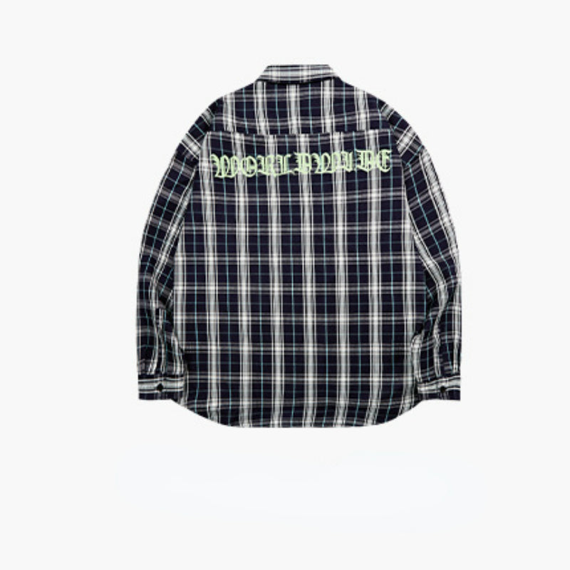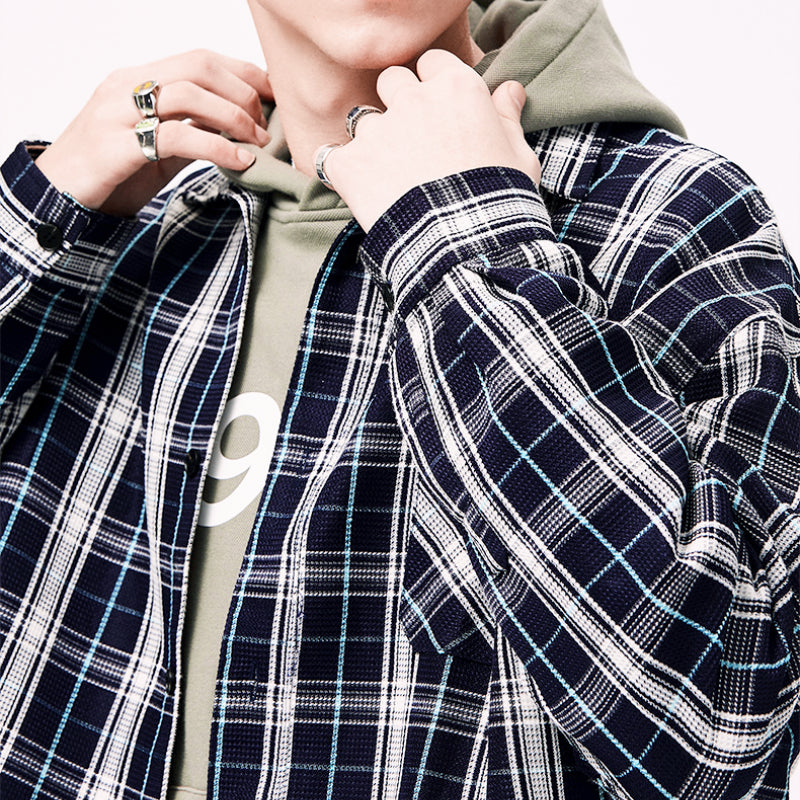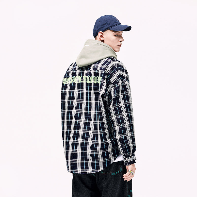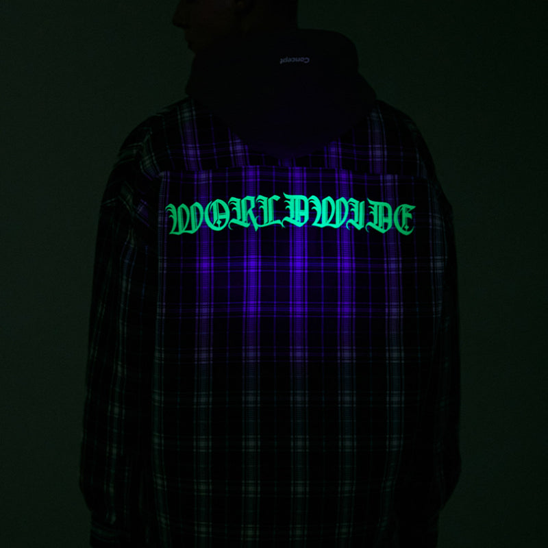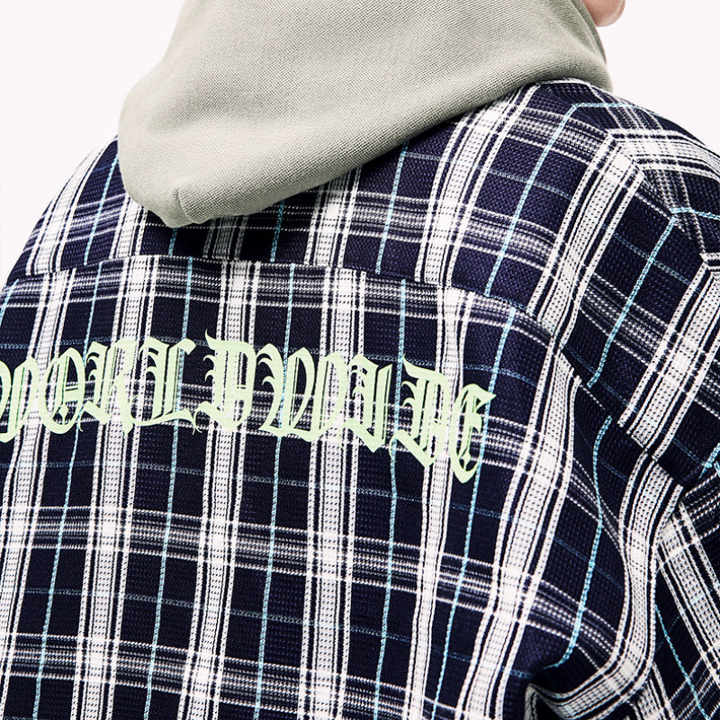 The Men's check shirt jacket is constructed from a viscose-polyester blend . It features a luminous print across the back , and has a loose fit, long sleeve, button down, a curved hem, a chest pocket.