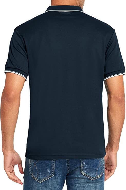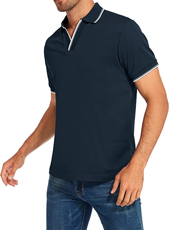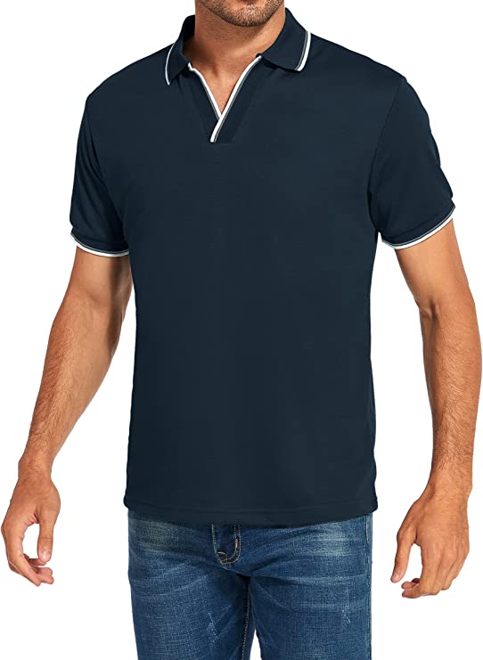 A men's golf polo shirt with V-neck collar, contrast color collar, regular fit. The golf polo shirts for men have V-neck and Contrast Trim Design, classic cut and soft fabric, removed easy-to-fall buttons. The V-neck makes your neck slenderer. Solid color t shirts can bring you simple style, make this loose polo tee go-to for the office or the weekend.