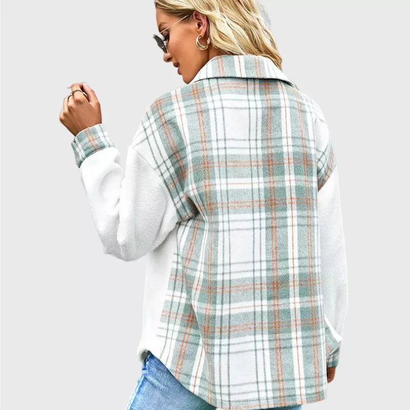 This womens sherpa shirt jacket is made by polyester blend, which is soft, comfortable, keep warm but don't look bulky and good stretch. Features a lapel collar, long sleeves with button cuffs, front button closure, chest pockets, checker are designed at collar and back side ,finished with U shape hems. The classic dropped shoulders and loose fit deserve this dress a place in your wardrobe.