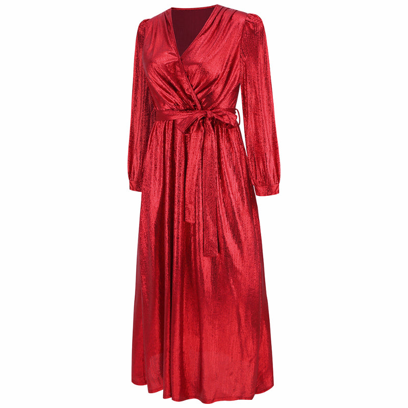 The women's metalic shiny dress features V-neck, long sleeve, solid color , sparkly, frill, ruffle with waist tie detail .Regular fit. Pair with chic heels for a glam finish,will ensure you sparkle at any party. This christmas warp party dress is the time to let your attractive take the first seat and become whoever you want.