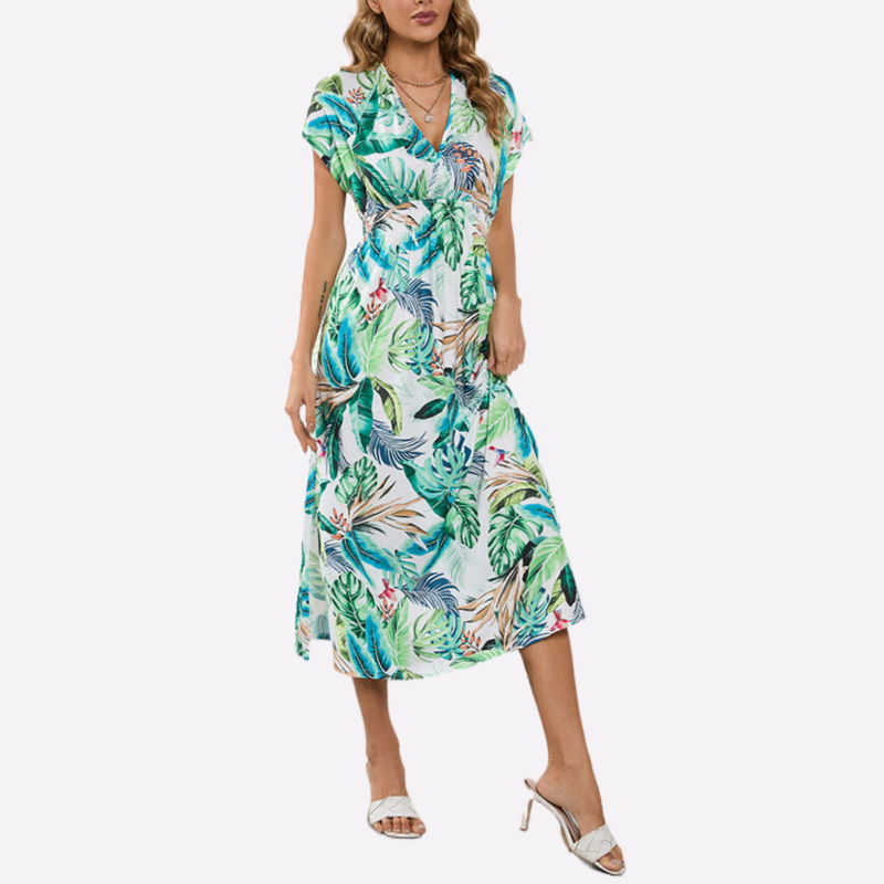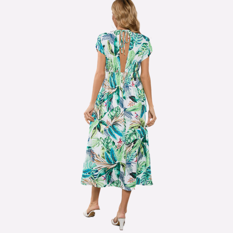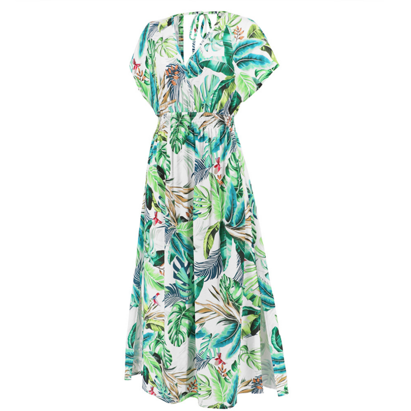 A Hawaiian Print Dresses featuring a flattering V-neckline and sleeveless design, boasts a sultry open back and an elastic waist that ensures a comfortable yet stylish fit. The double slits at the hem, which add a touch of edgy sophistication to the overall look. With this maxi dress featuring a vibrant Hawaii plants print, perfect for those balmy summer evening.