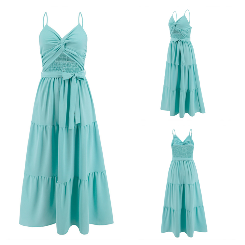 This Tie Front Dress features a flattering v neck and adjustable spaghetti straps that are perfect for showing off sun-kissed skin. The tie front detail adds a touch of sophistication while the ruffle hems give it a playful and feminine flair. With its below-the-knee length, this summer beach maxi dress is both elegant and practical, perfect for any occasion. Sleeveless making it ideal for hot summer days. A self-waist belt completes the look, cinching you in at all the right places and accentuating your curves.